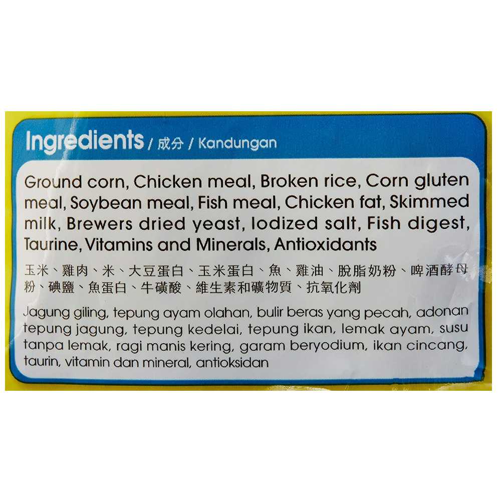 Wholegrain Cereals, Vegetable Protein, Fish meal, Cassava, Chicken fat, Brewers dried yeast, Protein from Milk & Ocean Fish, Poultry by-product meal, Iodized salt, Taurine, Vitamins and Minerals, Antioxidants.