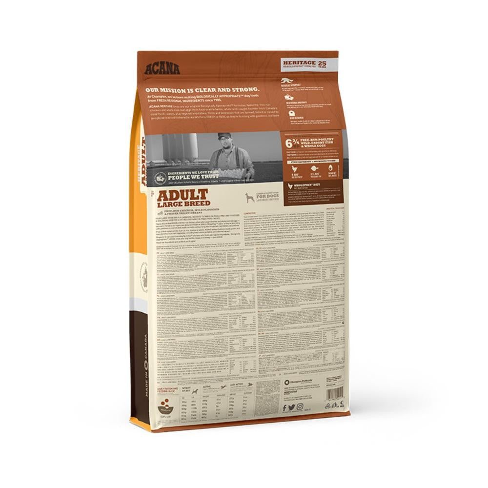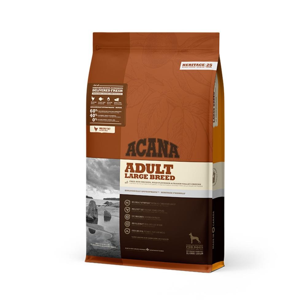 ACANA Large Breed dog food is nutrient-dense and high in protein, nourishing dogs completely with whole free-run chicken and turkey, wild-caught fish, and cage-free eggs. With rich inclusions of quality animal ingredients, ACANA dog food uses meat, organs, cartilage, and bone, delivering the nutrients dogs need naturally.