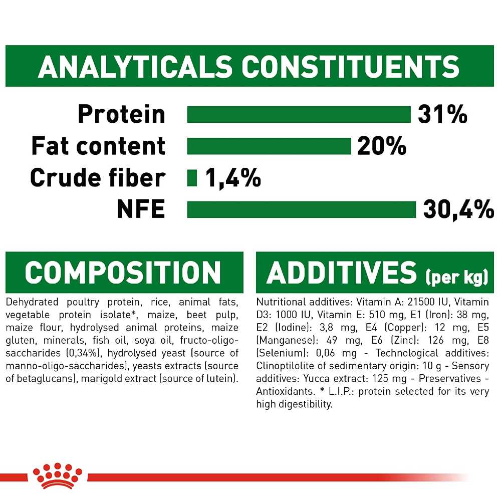 Dehydrated poultry protein, rice, animal fats, vegetable protein isolate*, maize, beet pulp, maize flour, hydrolysed animal proteins, maize gluten,soya oil, fish oil, minerals, fructo-oligo -saccharides, hydrolysed yeast (source of manno-oligo-saccharides), marigold extract (source of lutein).
