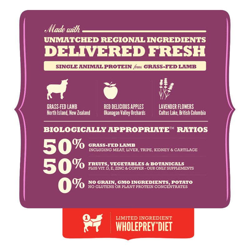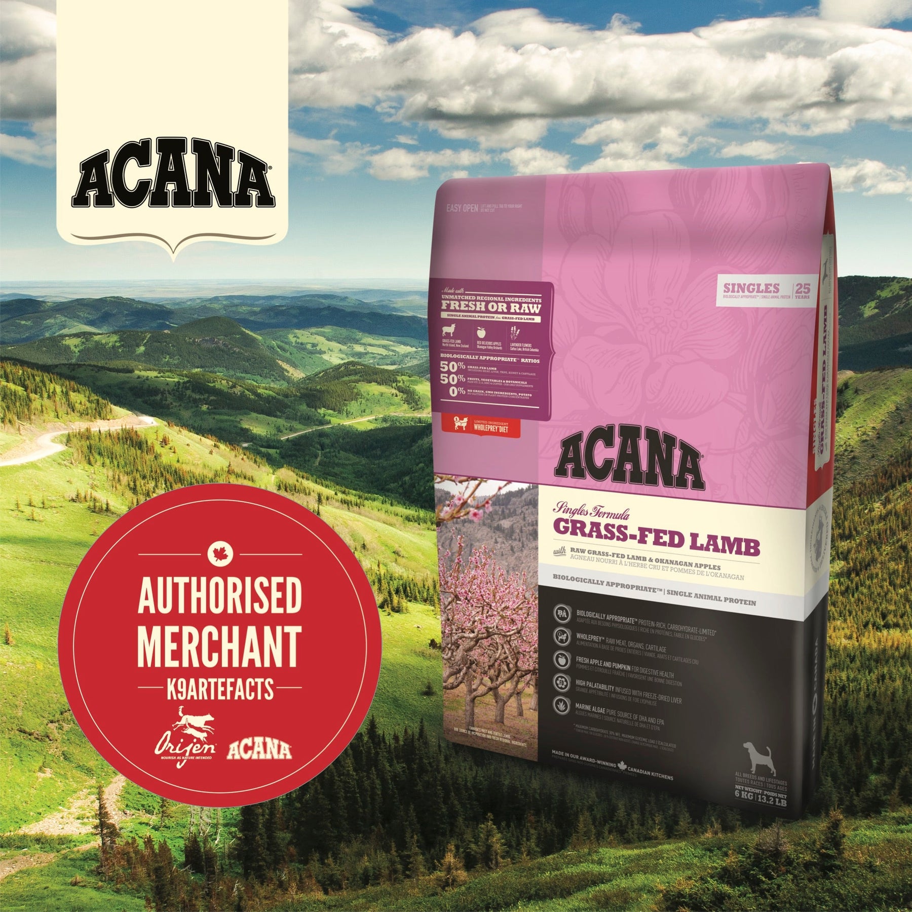 Acana Grass-Fed Lamb is loaded with 50% quality lamb ingredients in Whole Prey ratio of meat, organs, and cartilage, complemented with delicious, whole Red Delicious apples, providing your dog with the protein and nutrients they need in order to stay happy, healthy, and strong.