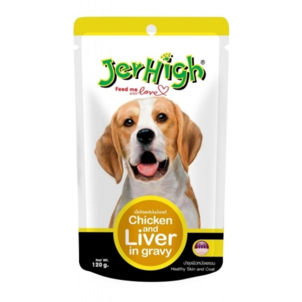 | JerHigh Grilled Chicken and Liver in Gravy is made from real chicken and liver meat and has been precisely prepared by our highly experienced expert team. It has also been researched and meticulously tested in the laboratory to ensure that the treat is hygienic, safe, and filled with all of the nutrients man’s best friend needs. You sure can reward them regularly with JerHigh Grilled Chicken and Liver in Gravy so they always stay healthy, happy, and full of energy.